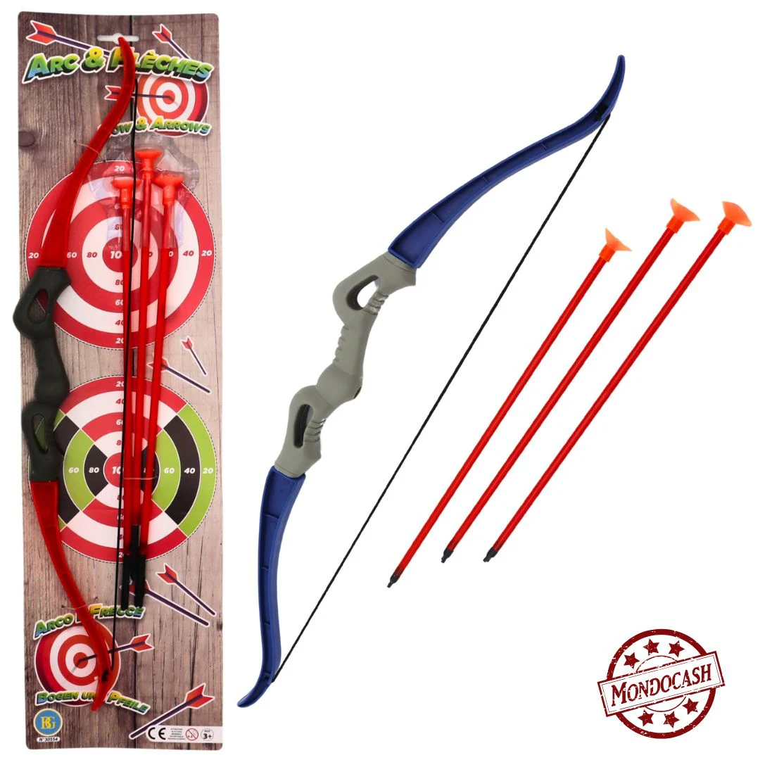 Jouet d’arc avec 3 flèches ventouses de couleur rouge ou bleu et avec 2 cibles sur le carton d’emballage