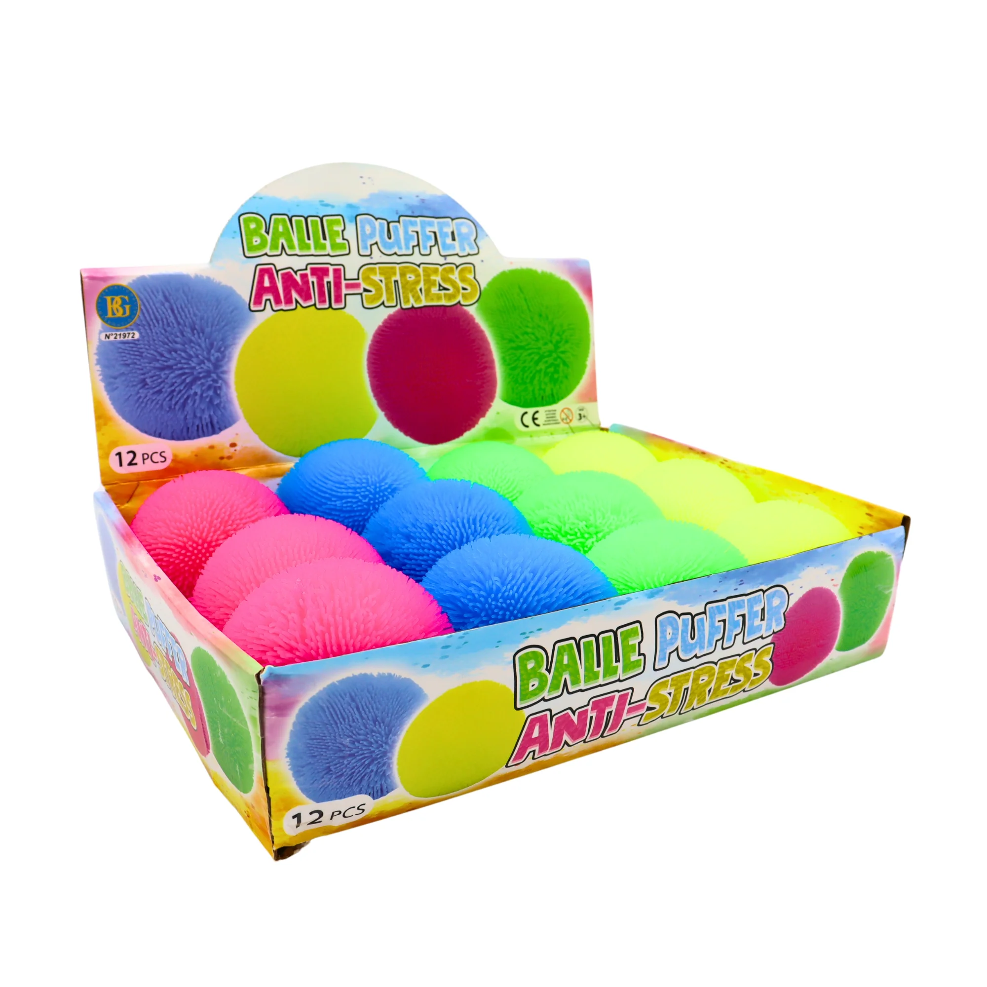 Balle puffer à malaxer de couleur bleu, rose, vert ou jaune