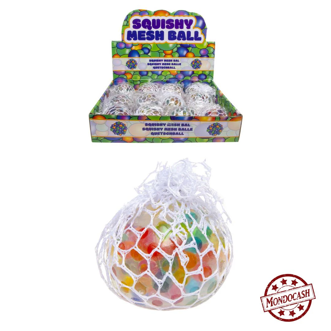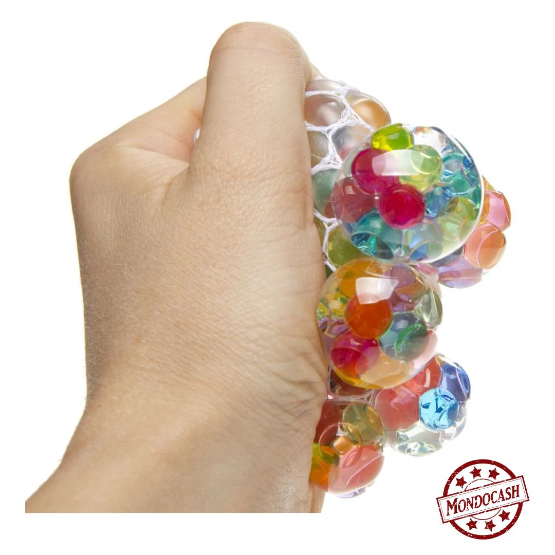 En serrant la balle dans la paume, les billes d’eau colorées sortent entre les mailles du filet.