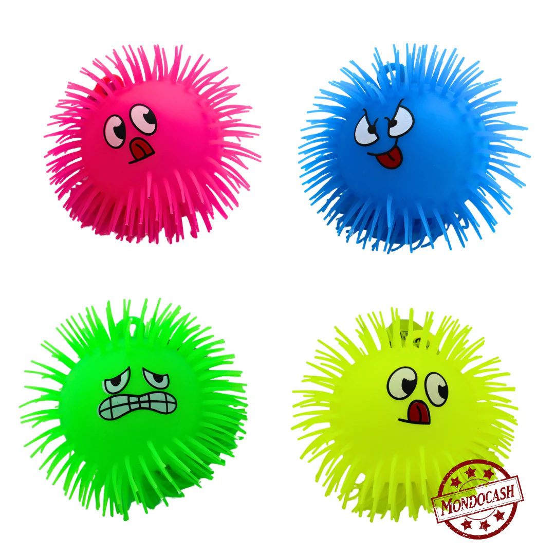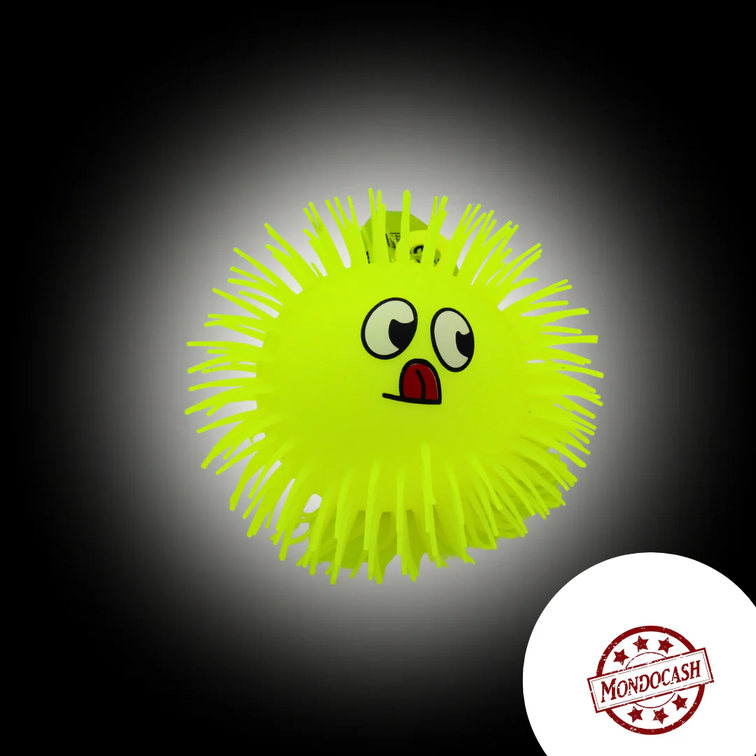Balle avec un visage et cheveux en picot souple avec une boule lumineuse à l’intérieur.
