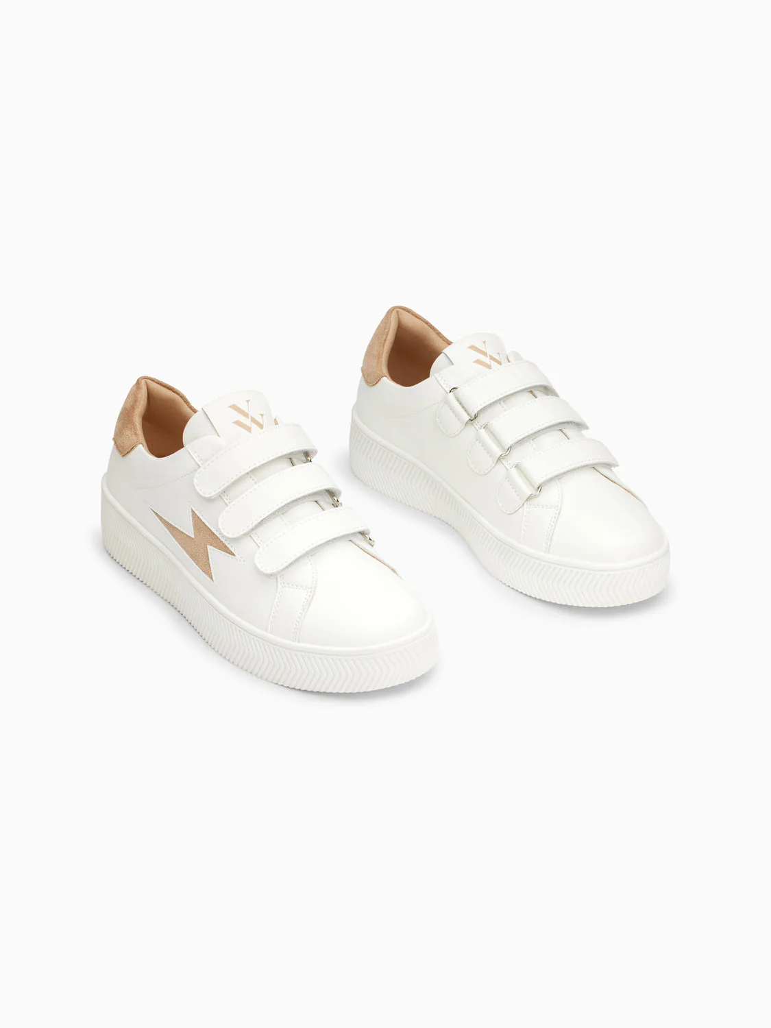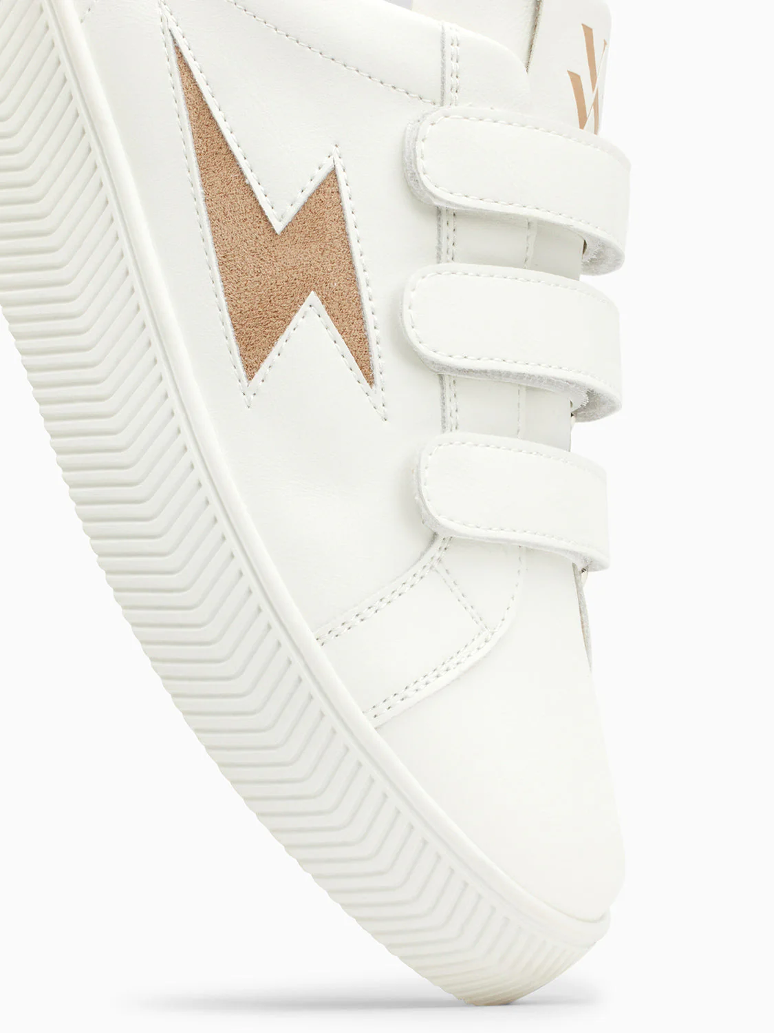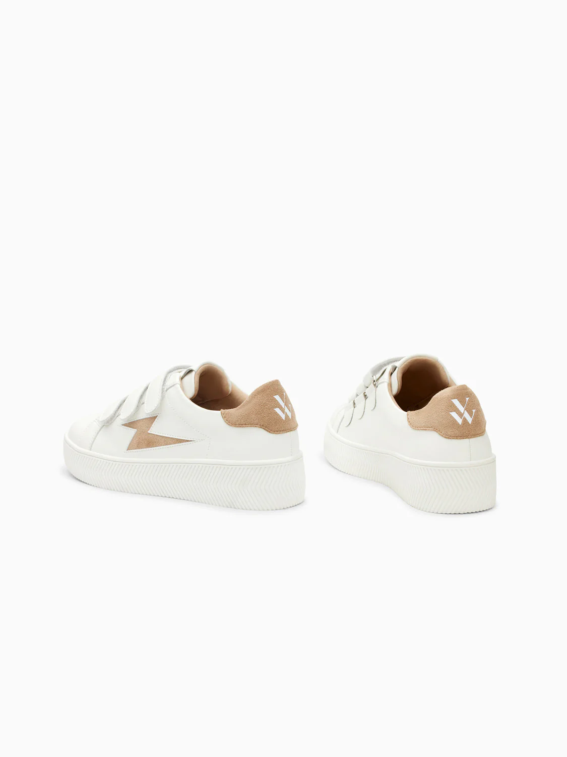 – Découpe en forme d’éclair et patch arrière en suédine beige