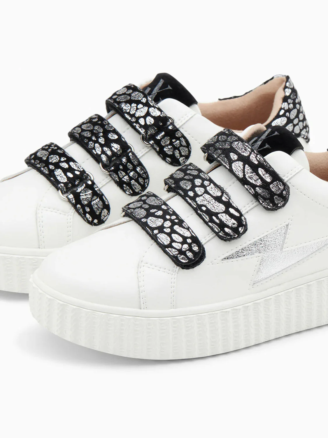 – Scratchs et patch arrière en suédine noire imprimé léopard argent métallisé