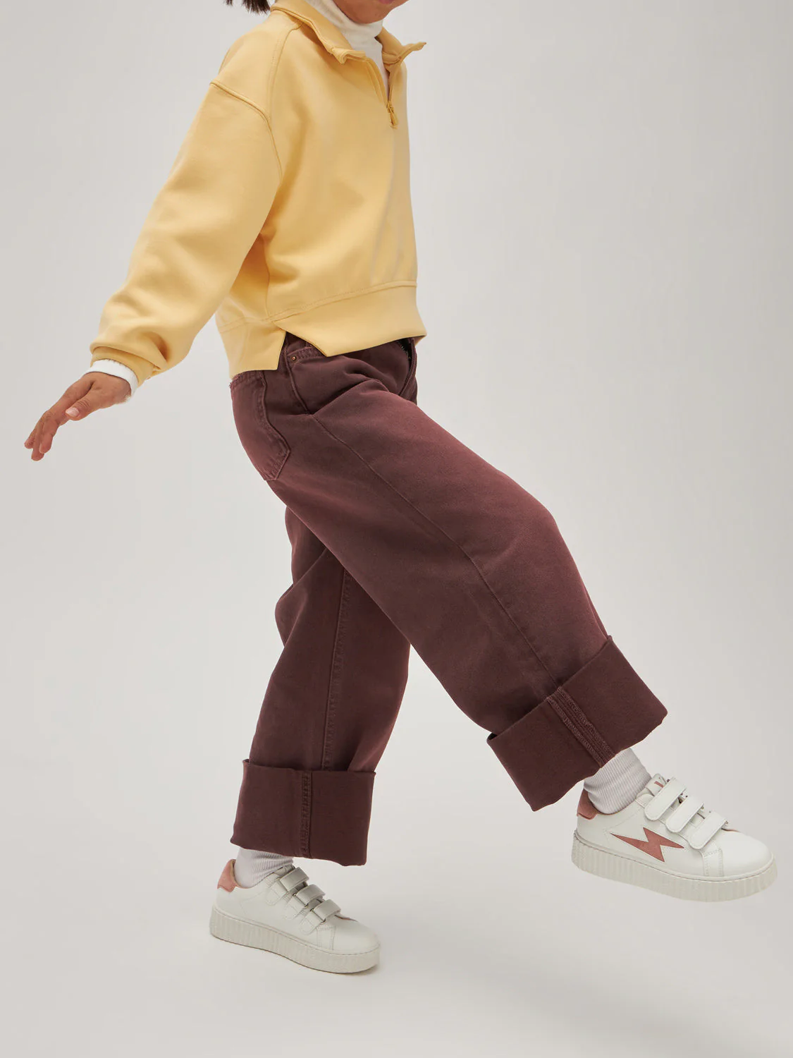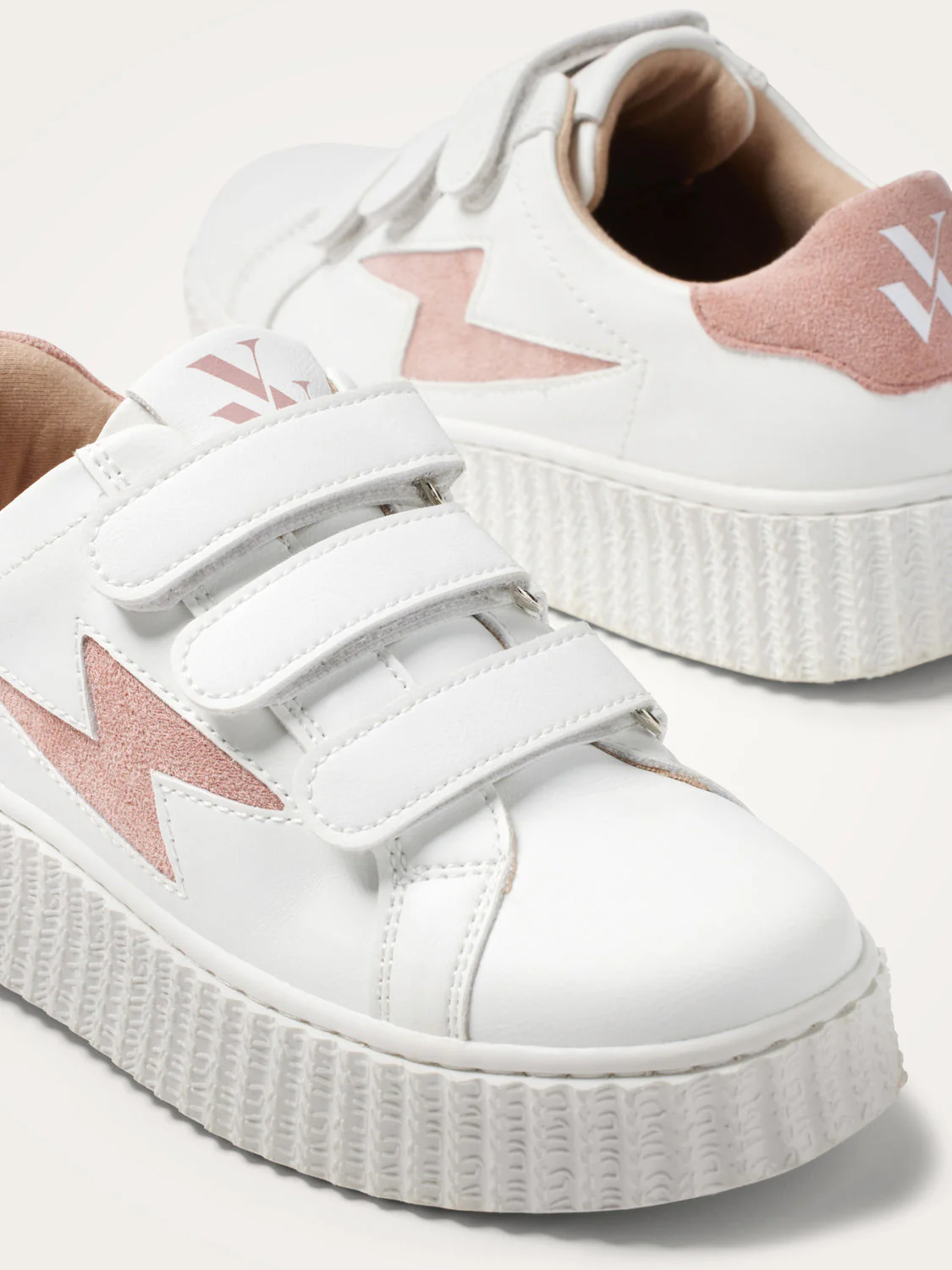 – Découpe en forme d’éclair et patch arrière en suédine vieux rose