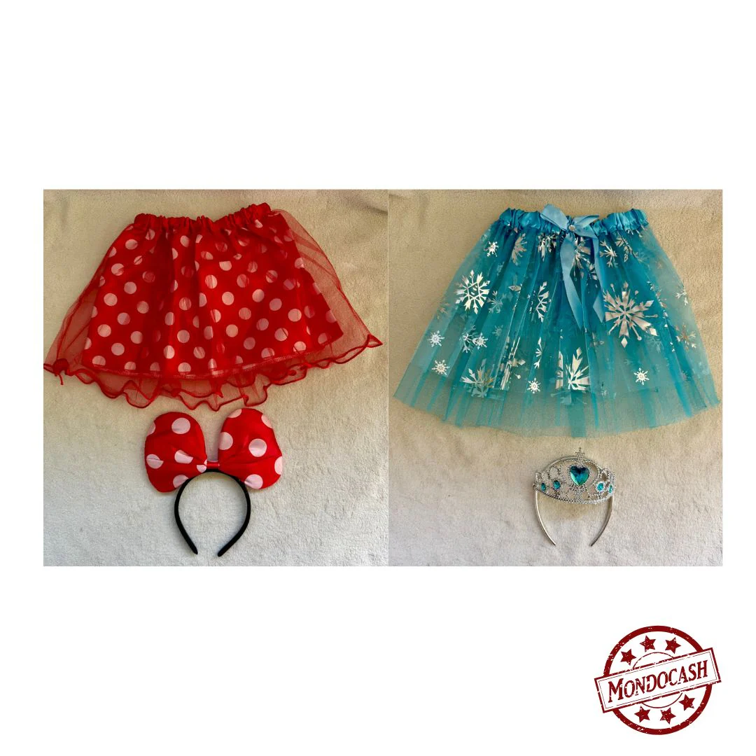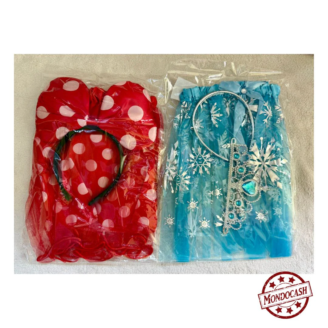 Déguisement de princesse des neiges en bleu et de Minnie en rouge, jupe et serre tête