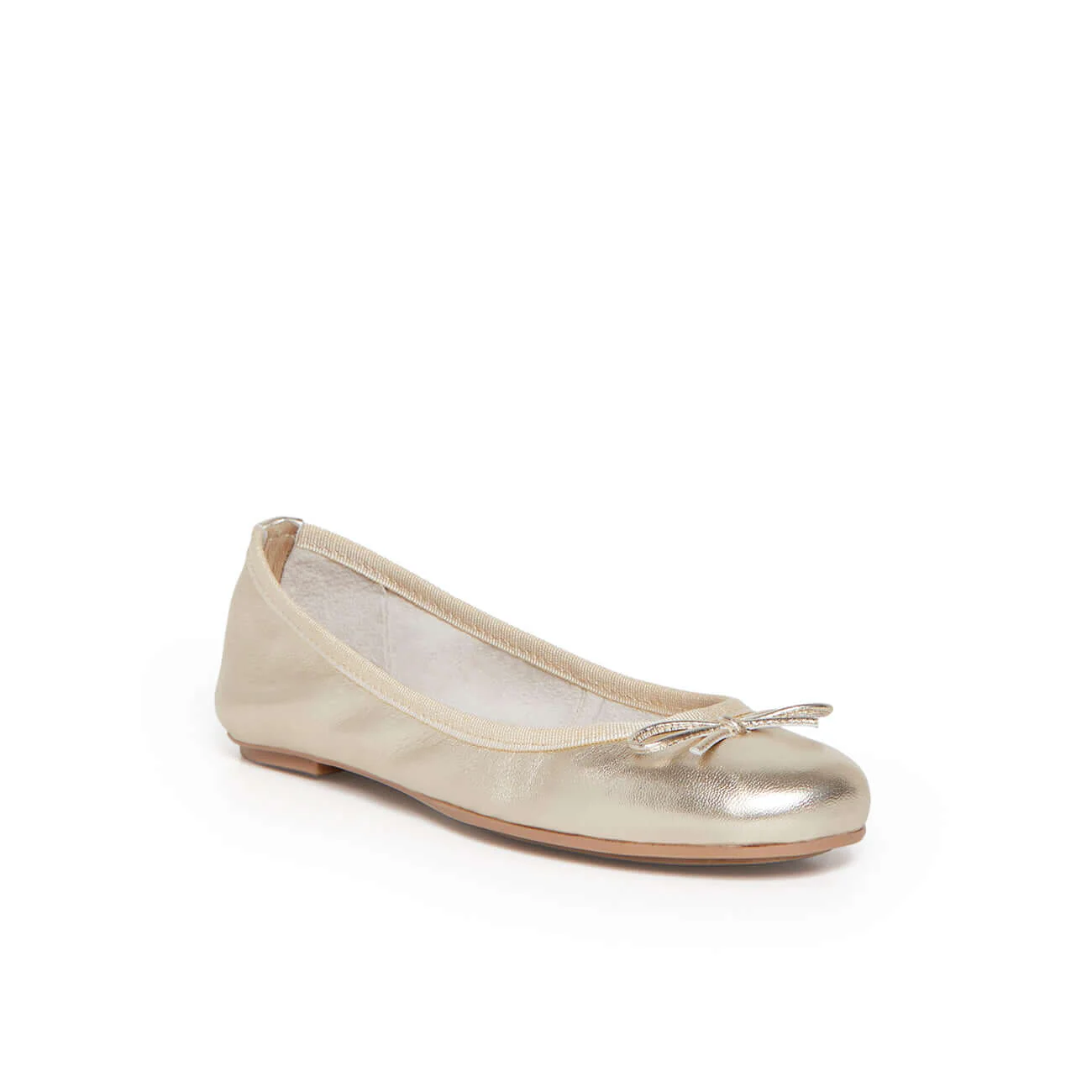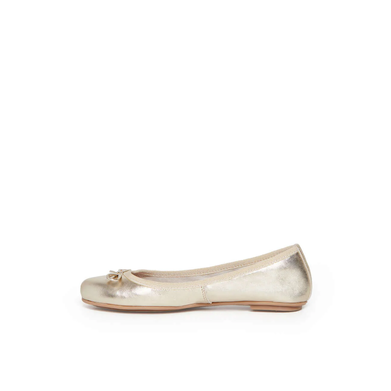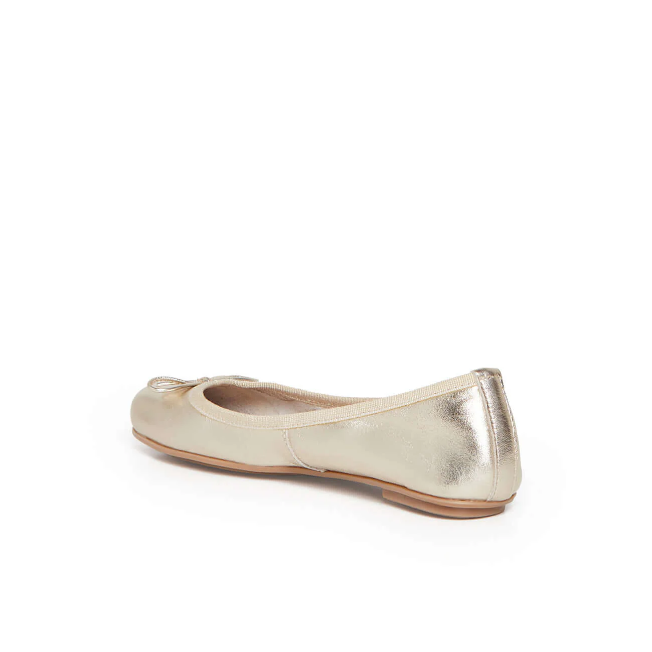 Avec son allure minimaliste et sa finition métallisée, la ballerine Geniale en cuir doré est la touche chic et lumineuse de votre dressing. Sa ligne épurée, soulignée d’un petit nœud discret, s’adapte à toutes vos envies, du look décontracté au plus habillé. Facile à enfiler et agréable à porter grâce à son talon plat de 1 cm, elle conjugue style et confort en toute simplicité.