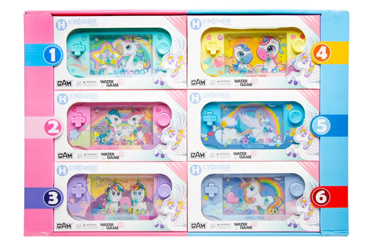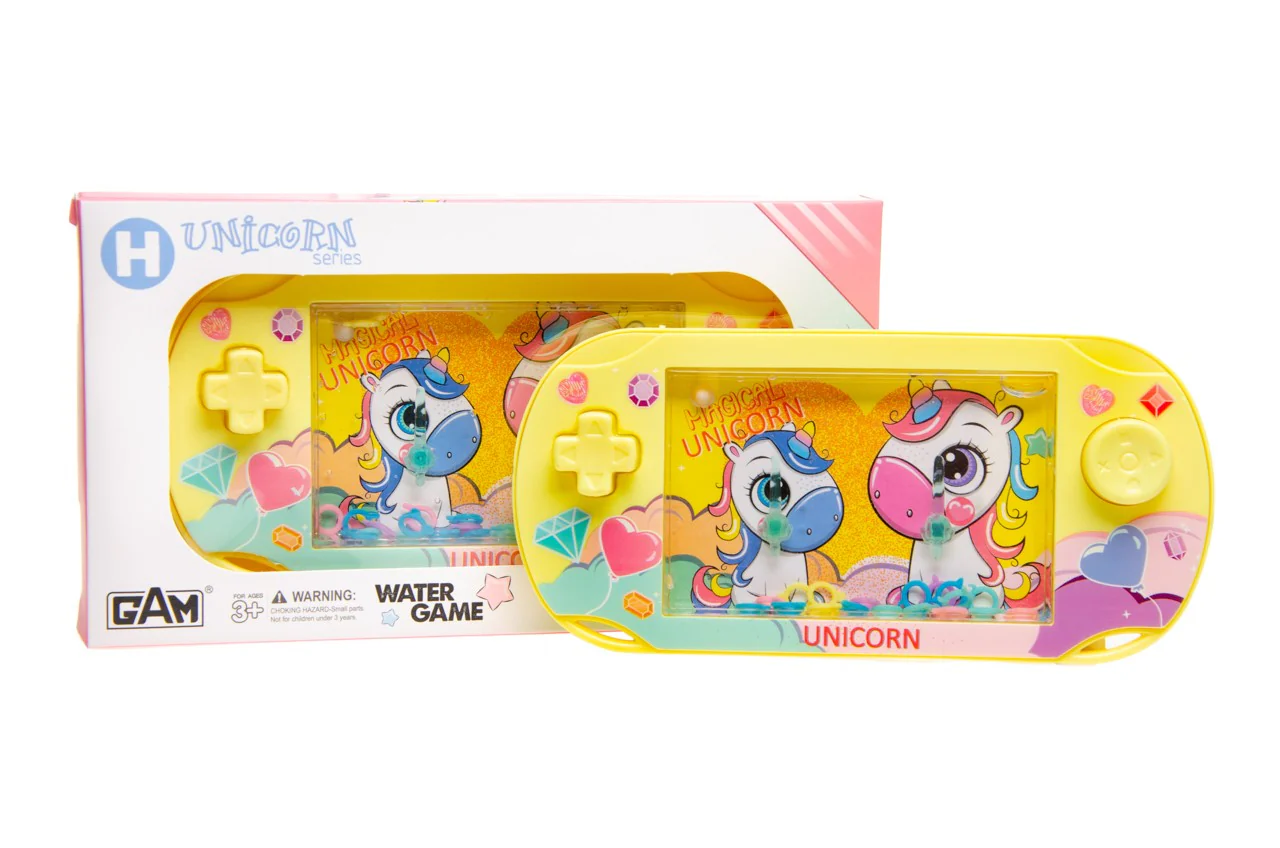 Jeu d’eau licorne, en forme de Gameboy, en appuyant sur le bouton l’air fait bouger les anneaux qu’il faut mettre sur les bâtonnets.