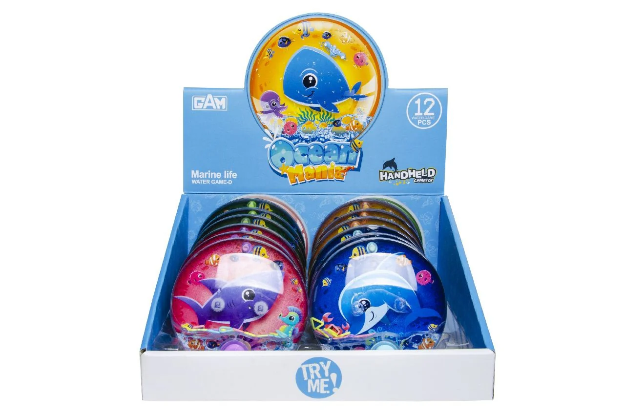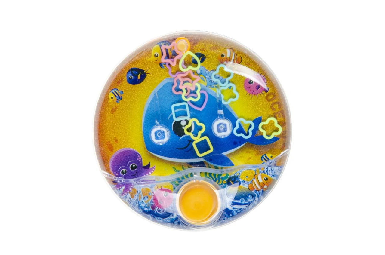 Jeu d’eau animaux, de forme ronde, en appuyant sur le bouton, l’air fait bouger les anneaux qu’il faut mettre sur les bâtonnets.